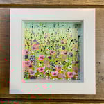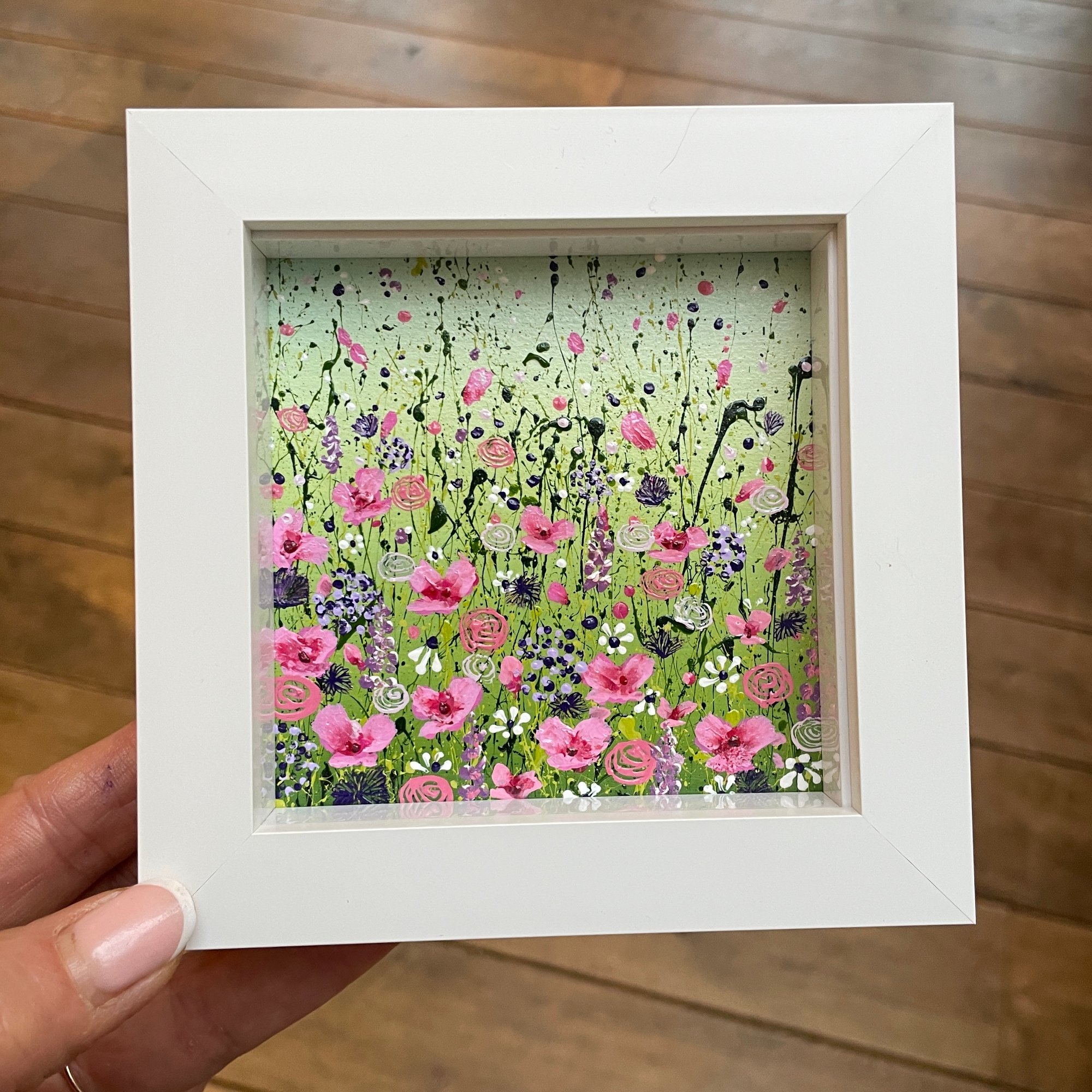 Original acrylic painting in 3.5cm deep white box frame which measures 12.5cm x 12.5cm with glass frontage. Aperture size 9cm x 9cm.