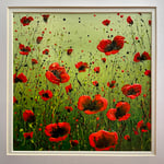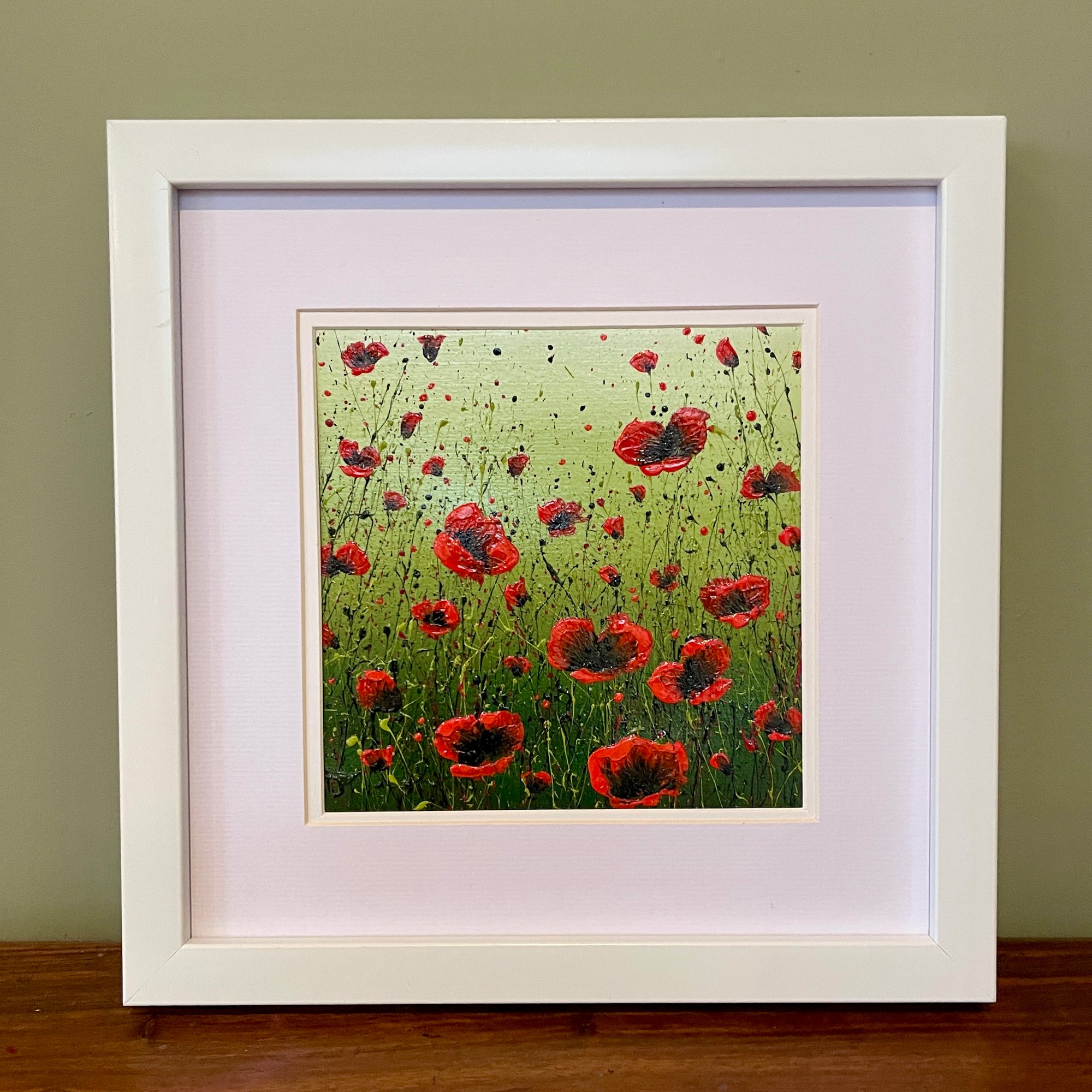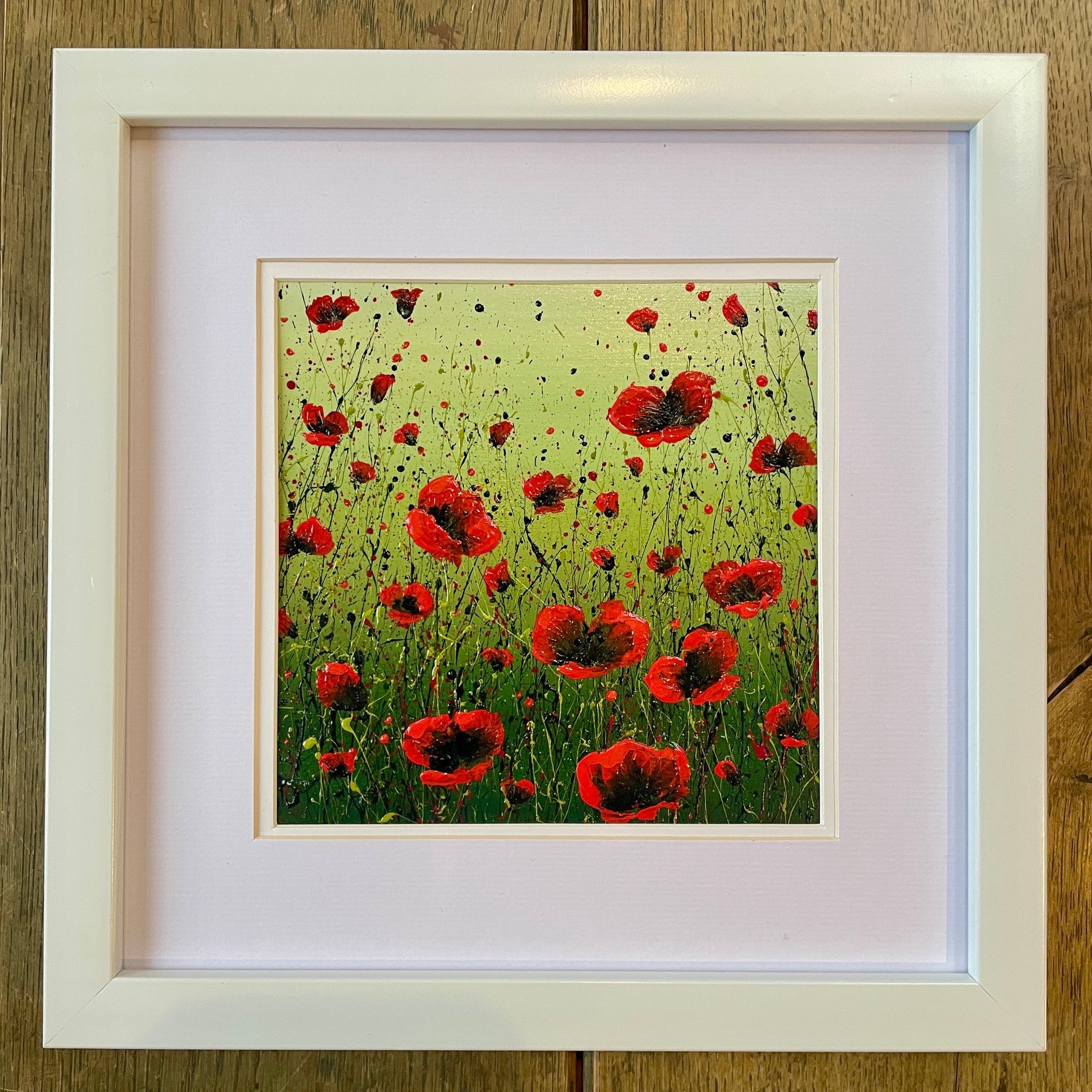 Double-mounted original acrylic painting in white frame which measures 25.5cm x 25.5cm with glass frontage. Aperture size 14.5cm x 14.5cm. A small fixture is fitted ready for you to hang your painting immediately and a back stand if you'd like to display on a tabletop.