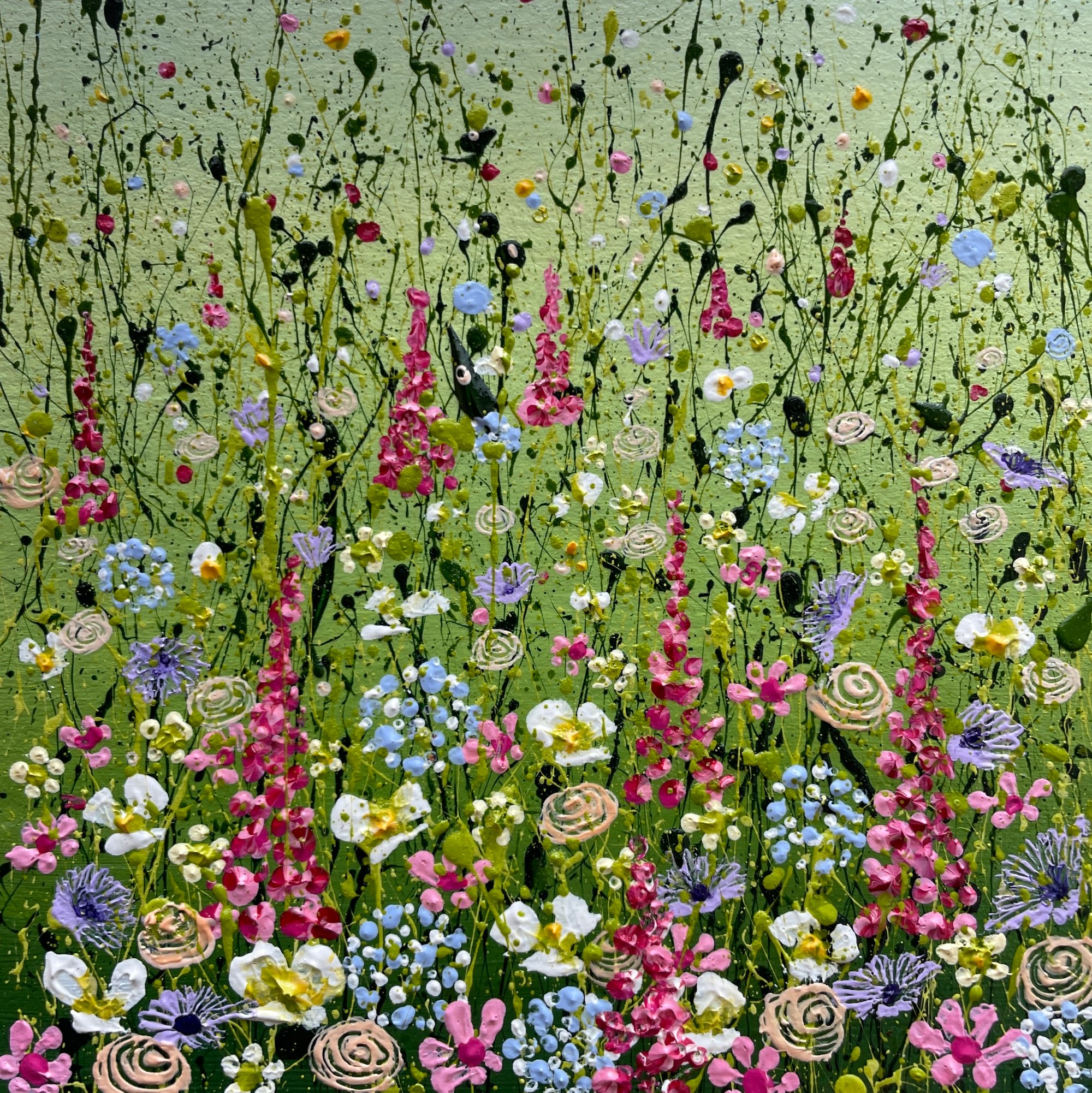 Original acrylic painting in 3.5cm deep white box frame which measures 12.5cm x 12.5cm with glass frontage. Aperture size 9cm x 9cm.